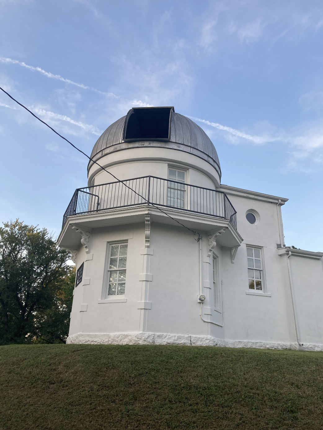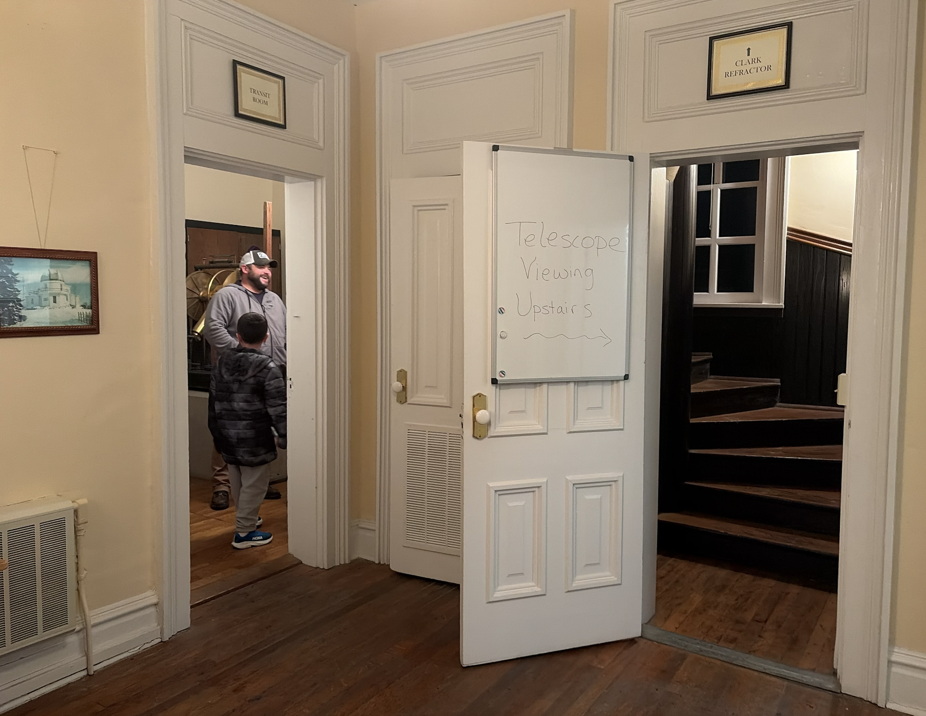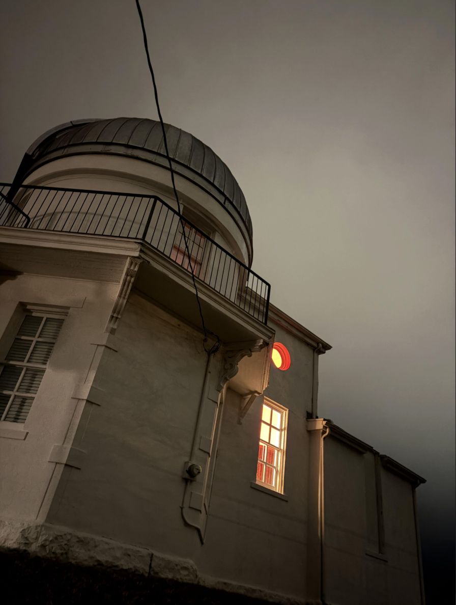 The observatory is beautiful from the outside. The top of it has a big metal dome that opens up so the Clark Refractor can stick itsbig nose out and look at everything. The dome gets stuck and can't open when it's too icy. To reduce visual distortion from heat, they don't heat the building in the winter, which makes for an extremely chilly open house. We use red lights upstairs since it impairs your vision the least.