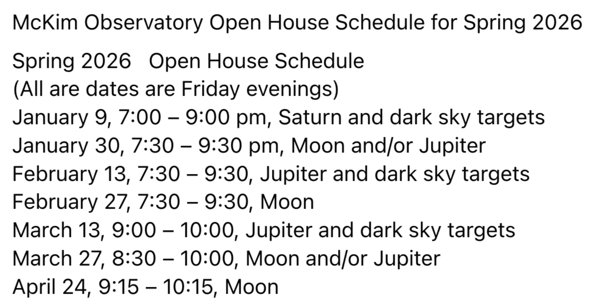 Through Fall 2025 and Spring 2026, I regularly volunteered at the McKim observatory. I worked closely with Dr. Mary Kertzman, Dr. Alexander Komives, Dr. Howard Brooks, and Dr. Oscar Qu to get a headcount of members of the Greencaslte community, greet people, answer questions, and give tours. We can see the Fall 2025 and Spring 2026 open house hours below, along with descriptions of what celestial bodies we observed with the Clark Refractor that night: